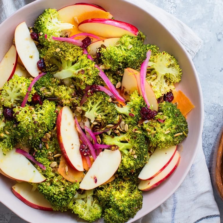 Save A vibrant, fresh salad featuring crisp broccoli and sweet-tart apple, tossed in a zesty dressing for a nutrient-packed, energizing meal.