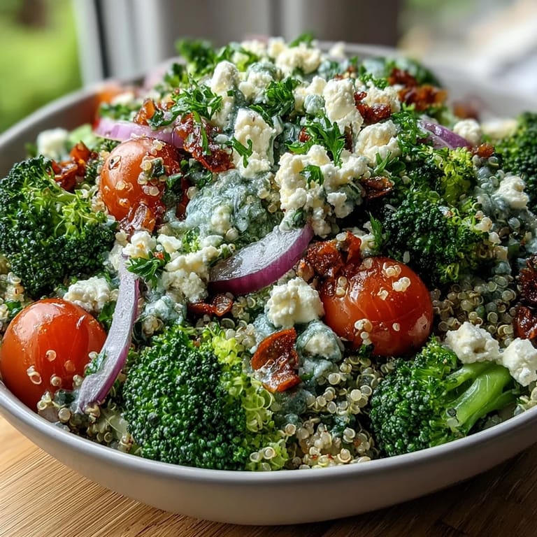 The skeleton of this bowl is solid, but it loves improvisation. I've made it with roasted chickpeas instead of feta on nights when I wanted more protein and less dairy, and I've added a handful of arugula at the last second for peppery bite. You could roast the broccoli instead of steaming it for a caramelized edge, or use white quinoa if that's what you have on hand—red quinoa works too and looks even more striking. The dressing is where your personality really shows: someone I know adds a spoonful of tahini to make it creamier, and I knew someone else who would stir in a tiny bit of honey to balance the lemon.