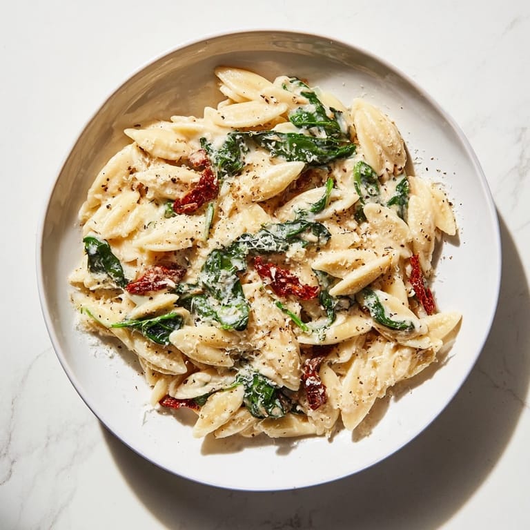 Save A rich and comforting bowl of orzo pasta simmered in a creamy garlic-Parmesan sauce with sun-dried tomatoes, spinach, and a hint of Italian herbs. Perfect for a satisfying vegetarian meal.