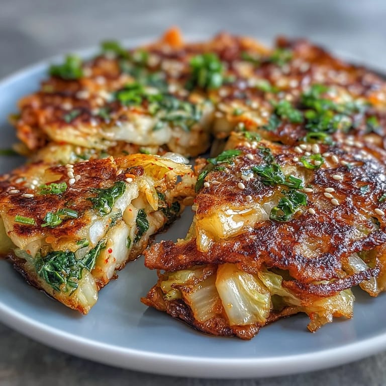 Save Back when I lived in a noisy apartment above a corner market, crispy cabbage kimchi pancakes became my go-to solution for late-night cravings and impromptu get-togethers. The satisfying sizzle every time the batter hit the pan made the small kitchen feel alive, and I soon associated that mouthwatering aroma with moments of creativity and comfort. Sometimes I'd whip up a batch in slippers, lingering over the spice and crunch while streetlights flickered outside. It was less about tradition, more about seeing what magic would happen with odds and ends from the fridge. Kimchi pancakes have since become my badge of resourcefulness, proof that something simple can still elicit excitement every single time.