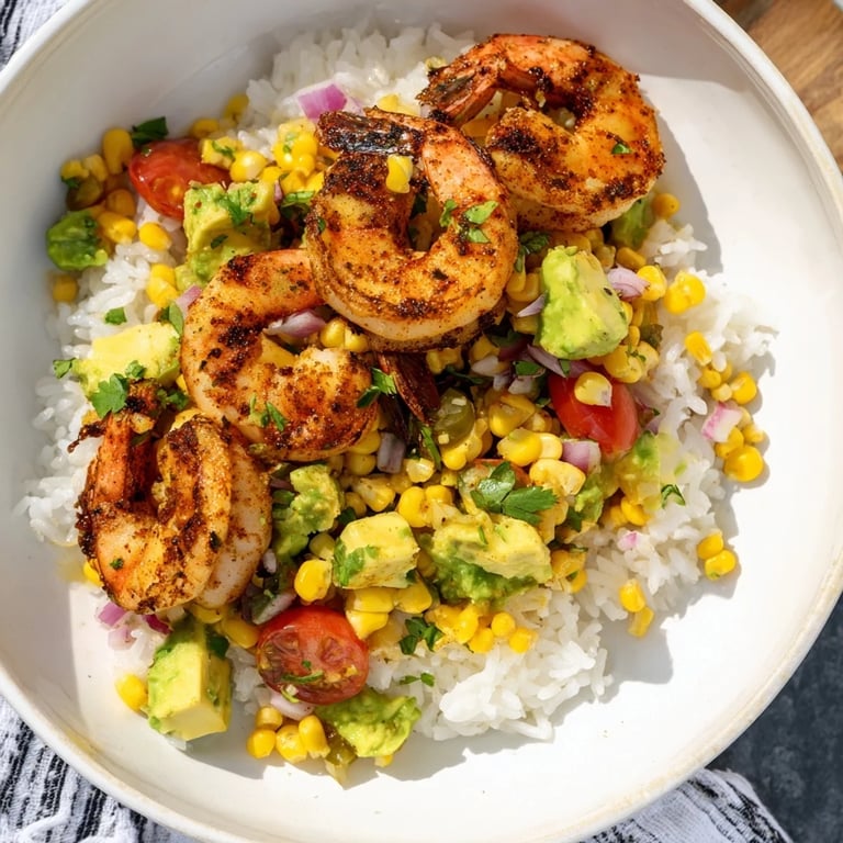 Save A fresh and vibrant bowl featuring juicy grilled shrimp, creamy avocado, sweet corn, and zesty lime over fluffy rice—a perfect light meal for summer.