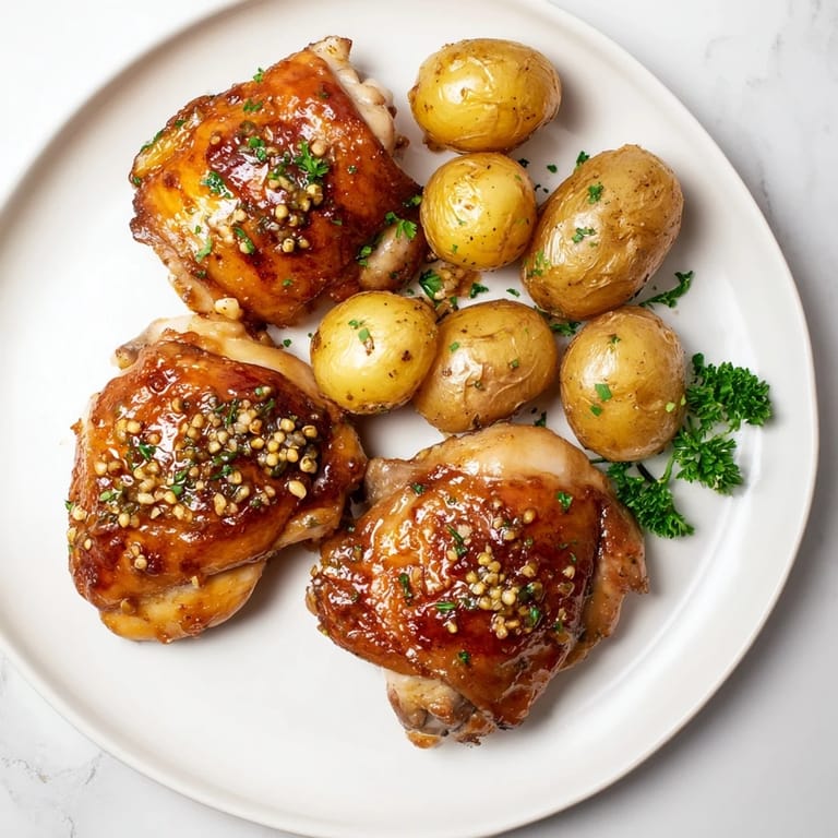 Save Succulent chicken thighs baked in a tangy honey mustard sauce, served alongside crispy roasted potatoes for a comforting, flavorful meal.