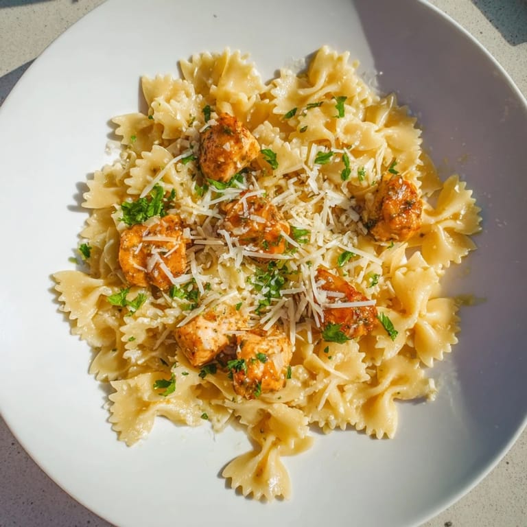Bowtie pasta (farfalle) is used, providing a perfect shape that holds the creamy sauce well.