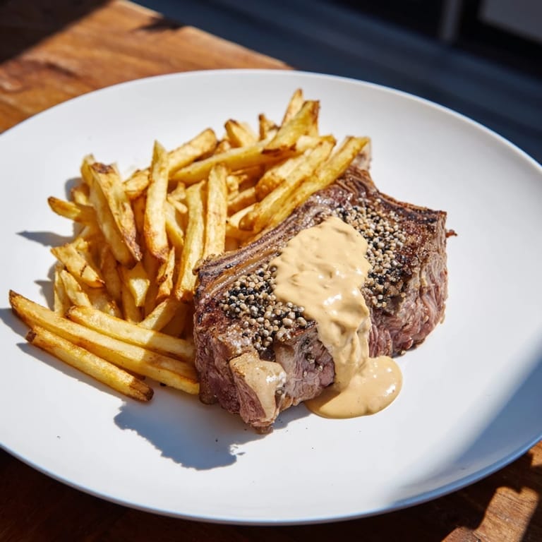 Save A sumptuous steakhouse favorite: juicy ribeye steaks coated in cracked peppercorns, pan-seared to perfection, and served with golden, crispy fries for an indulgent meal.
