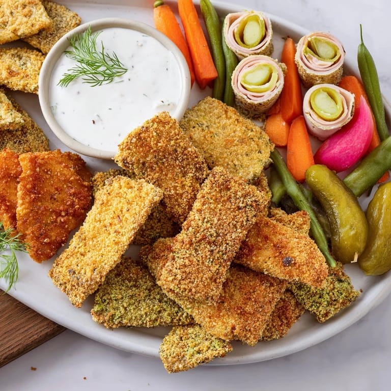 Save A tangy, crunchy feast featuring crispy fried pickles, a variety of pickled vegetables, and a playful twist with pickled-wrapped bites: perfect for true pickle enthusiasts.