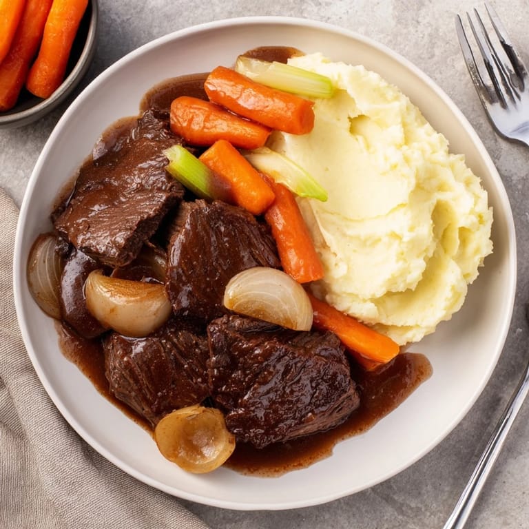 Save A classic, comforting dish featuring tender beef pot roast slow-cooked with vegetables and rich gravy, served alongside creamy mashed potatoes.