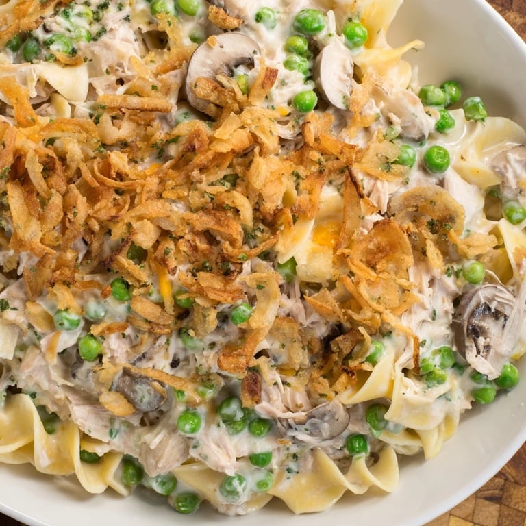 Save A comforting, creamy classic featuring tender noodles, savory tuna, and a golden, crunchy onion topping — perfect for family dinners or cozy gatherings.