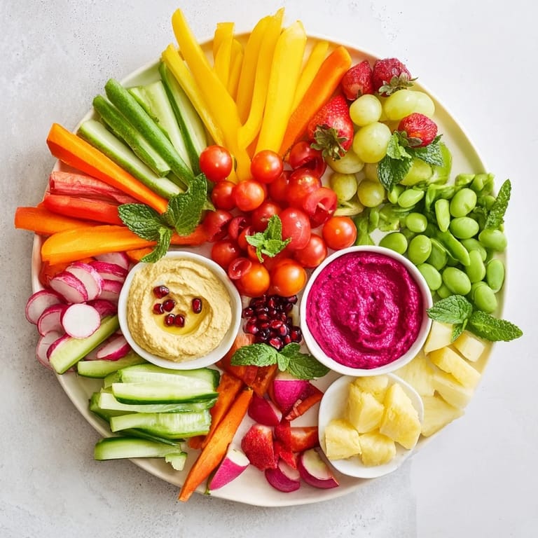 This recipe is a template, not a rule book, and it's strongest when you adapt it to what's available and what you love. In summer, add corn cobs, juicy peaches, and fresh berries. In fall, roast some chickpeas with paprika and add them for crunch, or scatter candied pecans for warmth. I've made this platter with roasted vegetables in winter, with marinated olives, with roasted seeds, with everything from my garden. The structure stays the same—dips in the center, vegetables and fruits arranged in groups—but the details become your signature.