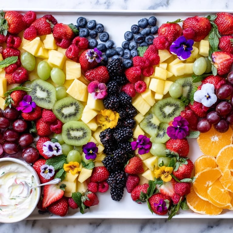 A vibrant and whimsical fruit platter arranged in the shape of a butterfly, perfect for spring gatherings, brunches, or childrens parties. Fresh, colorful fruits are paired with creamy yogurt dip and edible flowers to create a stunning, healthy centerpiece.