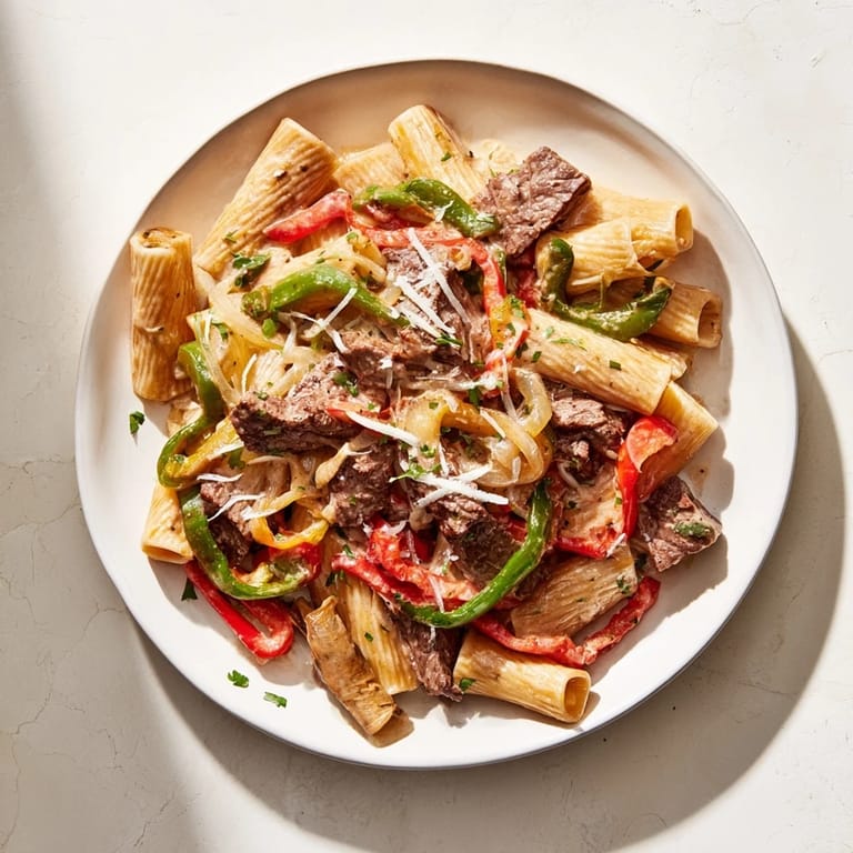 Save A hearty pasta dish inspired by the classic Philly cheesesteak, featuring tender beef, sautéed peppers and onions, and a creamy cheese sauce tossed with pasta.