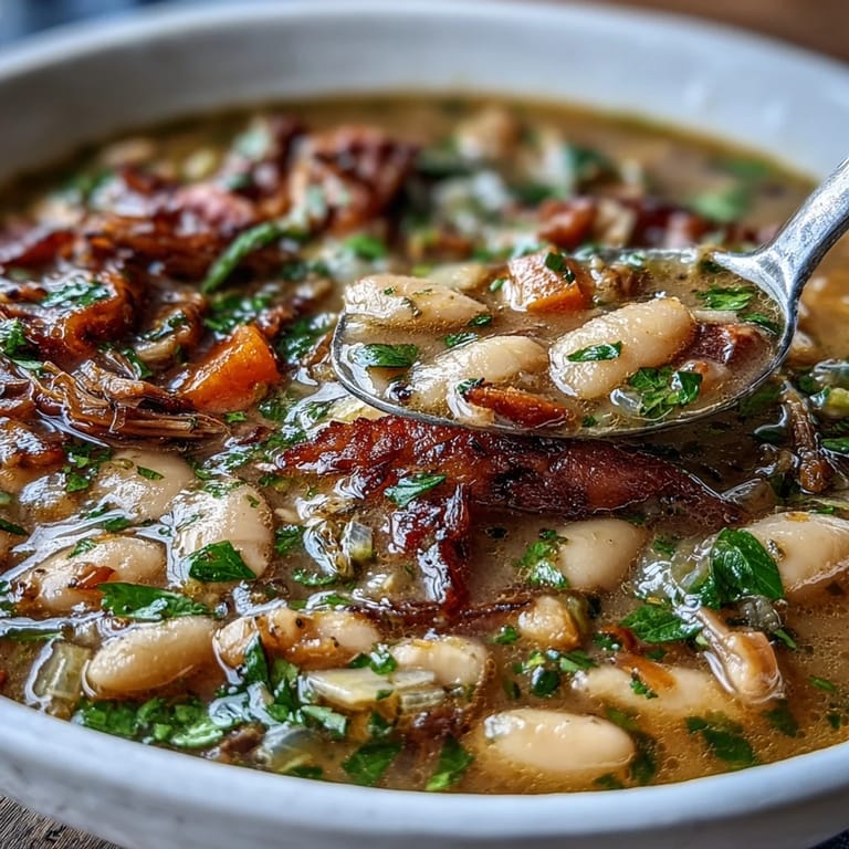 This hearty dish features tender white beans simmered with smoky ham hock, diced onion, carrots, celery, and garlic. Aromatic bay leaves, thyme, and a hint of smoked paprika create a warm, savory flavor. Slow simmering for over two hours allows flavors to meld beautifully, while shredded ham adds depth. Garnished with fresh parsley, this comforting Southern classic pairs perfectly with crusty bread and freezes well for future meals.